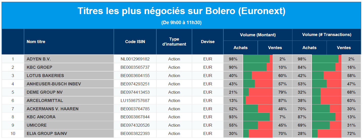 Chaque jour, nous vous offrons un aperçu des titres les plus négociés chez Bolero sur Euronext. Idéal pour prendre la température du marché boursier et pour découvrir les actions ou les titres que les autres investisseurs s'arrachent !