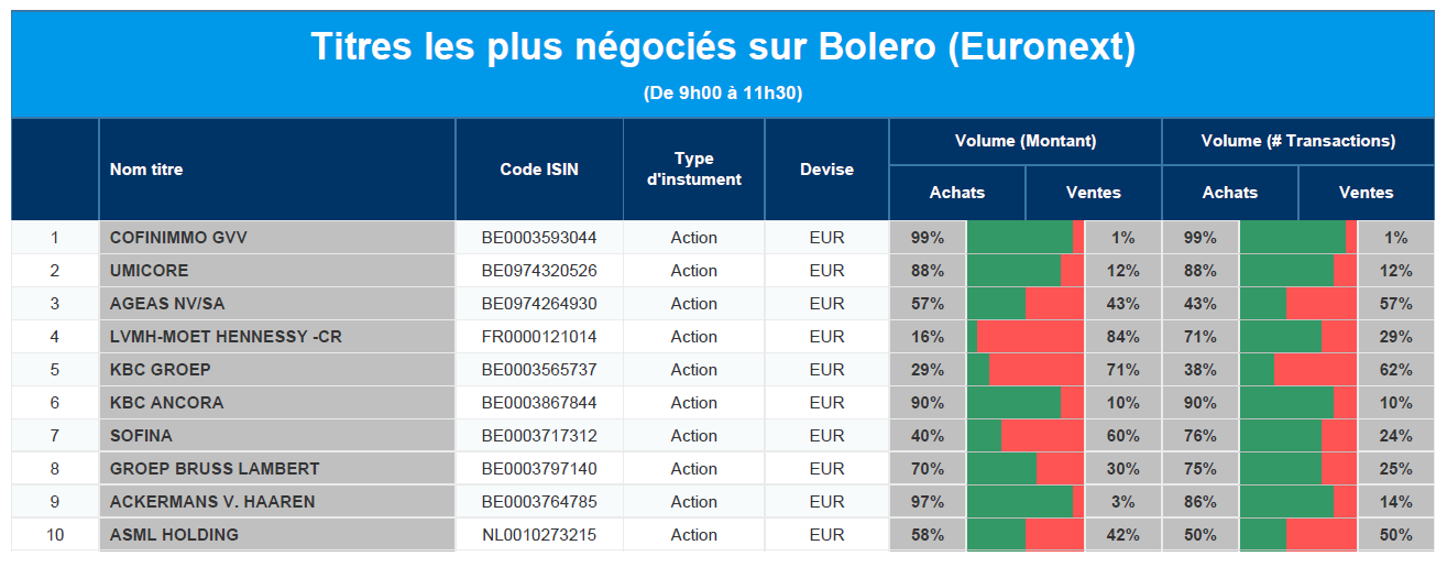 Chaque jour, nous vous offrons un aperçu des titres les plus négociés chez Bolero sur Euronext. Idéal pour prendre la température du marché boursier et pour découvrir les actions ou les titres que les autres investisseurs s'arrachent !