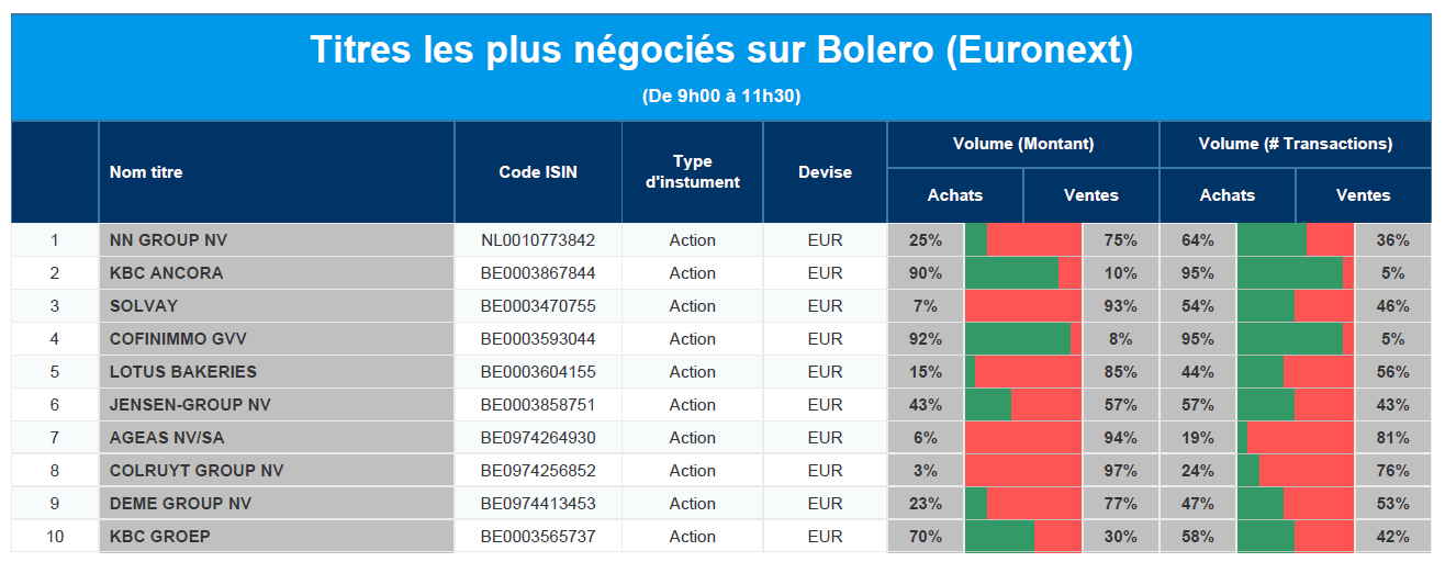 Chaque jour, nous vous offrons un aperçu des titres les plus négociés chez Bolero sur Euronext. Idéal pour prendre la température du marché boursier et pour découvrir les actions ou les titres que les autres investisseurs s'arrachent !