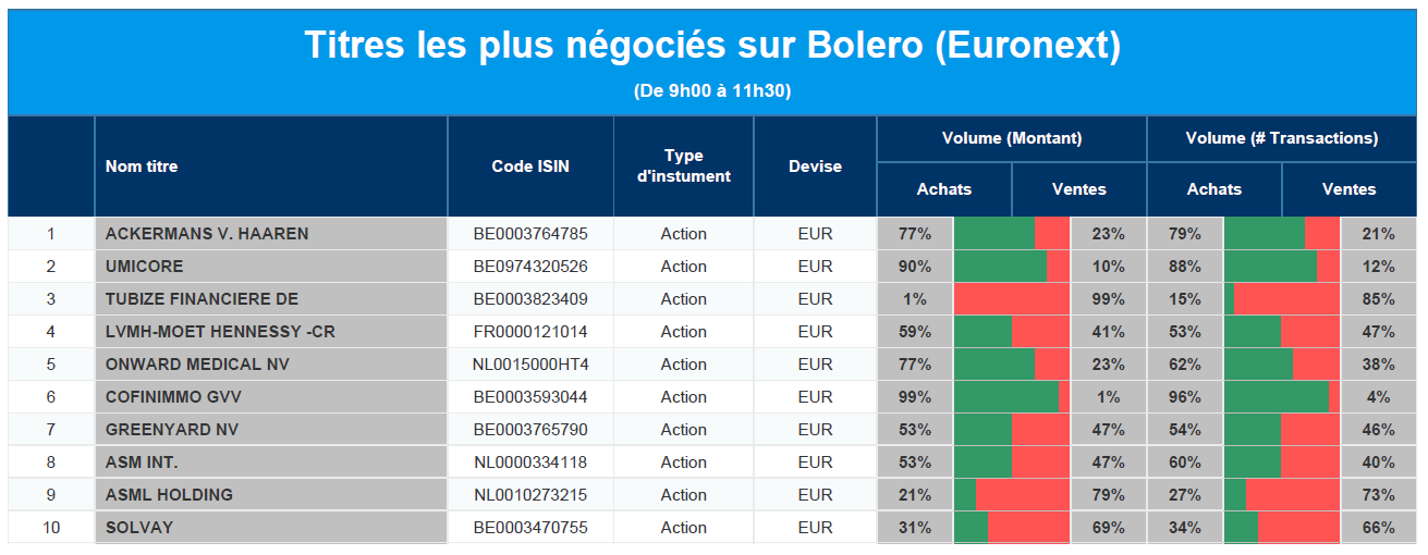 Chaque jour, nous vous offrons un aperçu des titres les plus négociés chez Bolero sur Euronext. Idéal pour prendre la température du marché boursier et pour découvrir les actions ou les titres que les autres investisseurs s'arrachent !