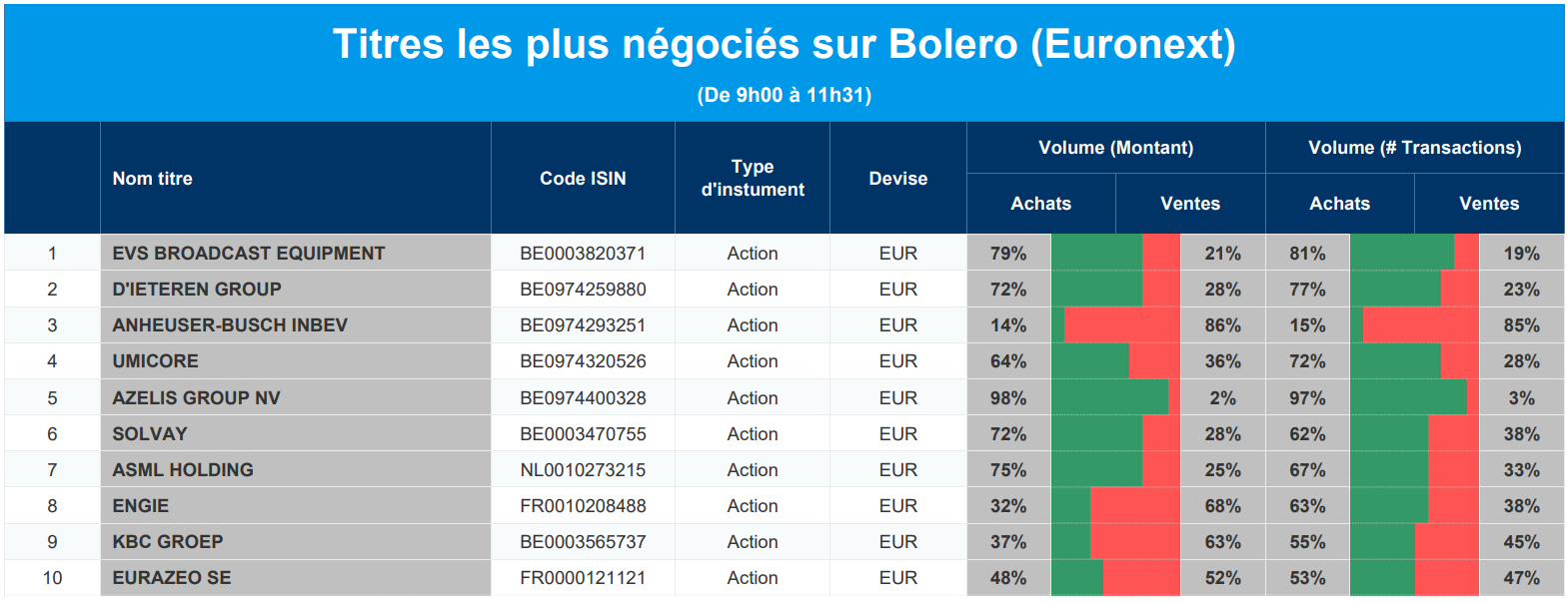 Chaque jour, nous vous offrons un aperçu des titres les plus négociés chez Bolero sur Euronext. Idéal pour prendre la température du marché boursier et pour découvrir les actions ou les titres que les autres investisseurs s'arrachent !