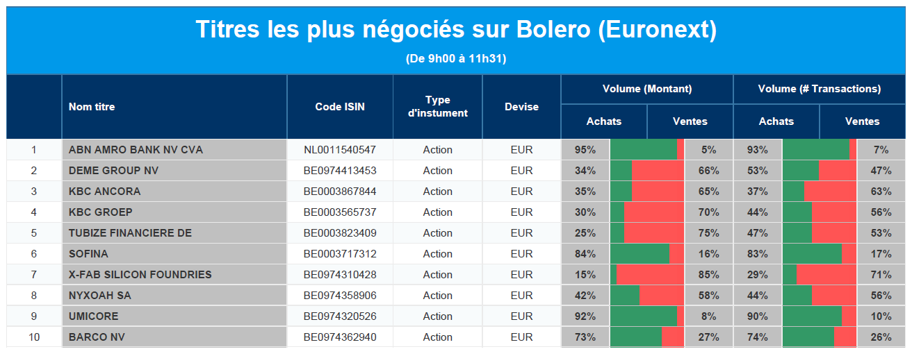 Chaque jour, nous vous offrons un aperçu des titres les plus négociés chez Bolero sur Euronext. Idéal pour prendre la température du marché boursier et pour découvrir les actions ou les titres que les autres investisseurs s'arrachent !