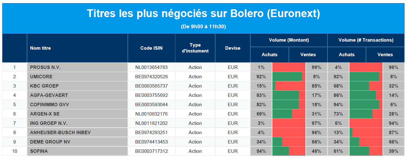 Chaque jour, nous vous offrons un aperçu des titres les plus négociés chez Bolero sur Euronext. Idéal pour prendre la température du marché boursier et pour découvrir les actions ou les titres que les autres investisseurs s'arrachent !