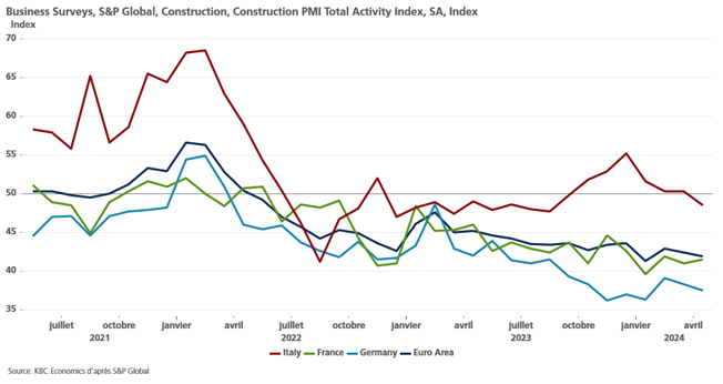 Et d’autre part, le secteur de la construction ne montre aucun signe d’amélioration selon l’indice PMI. Comme les mois précédents, le secteur du logement est sous pression, mais l’activité commerciale s’est également repliée et surtout le génie civil a enregistré sa plus forte baisse depuis le début de l’année.