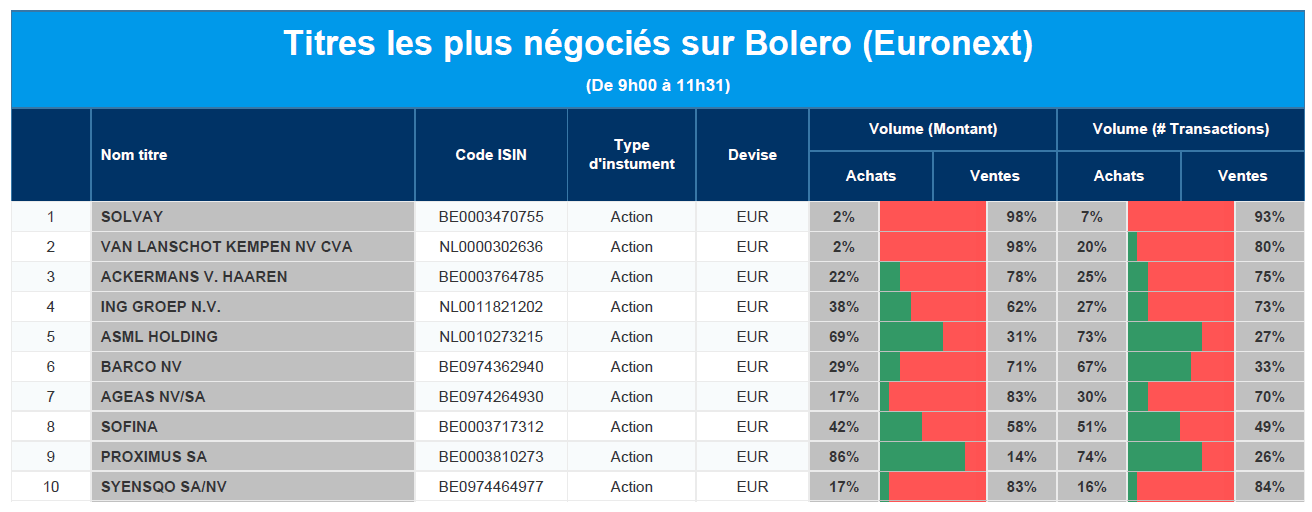 Chaque jour, nous vous offrons un aperçu des titres les plus négociés chez Bolero sur Euronext. Idéal pour prendre la température du marché boursier et pour découvrir les actions ou les titres que les autres investisseurs s'arrachent !