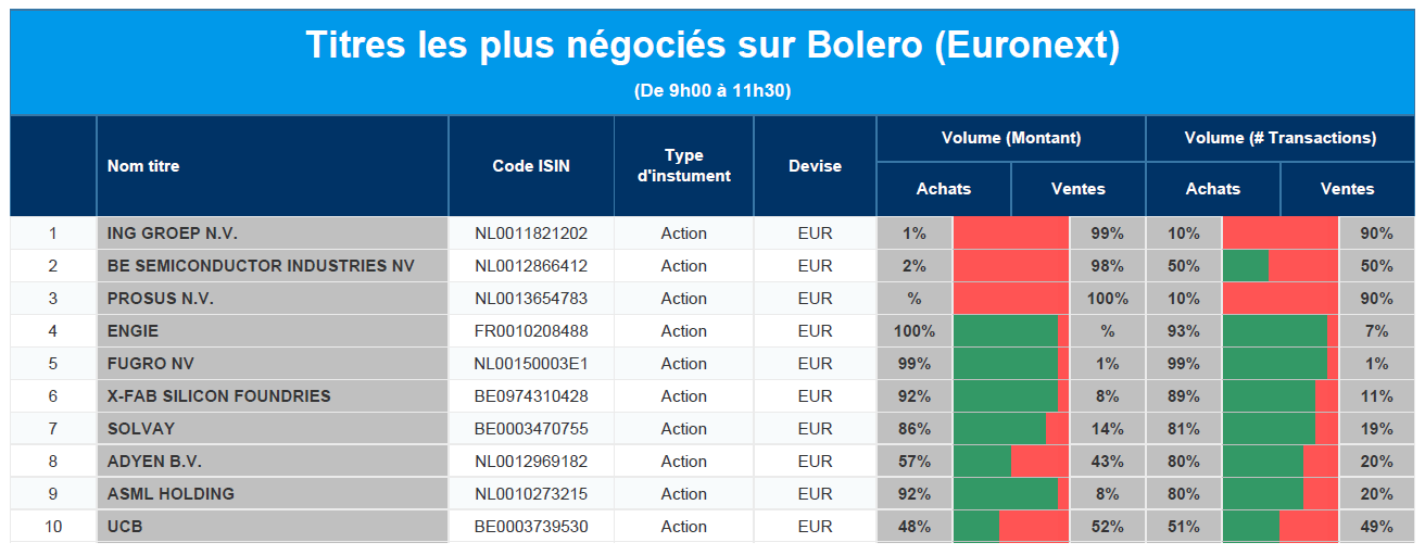 Chaque jour, nous vous offrons un aperçu des titres les plus négociés chez Bolero sur Euronext. Idéal pour prendre la température du marché boursier et pour découvrir les actions ou les titres que les autres investisseurs s'arrachent !