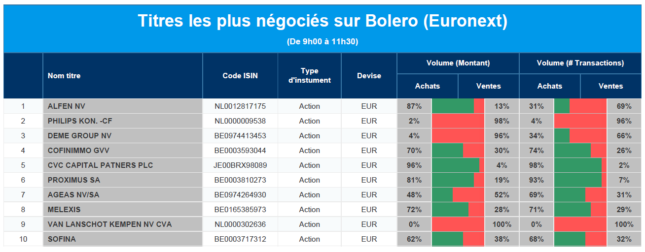 Chaque jour, nous vous offrons un aperçu des titres les plus négociés chez Bolero sur Euronext. Idéal pour prendre la température du marché boursier et pour découvrir les actions ou les titres que les autres investisseurs s'arrachent !