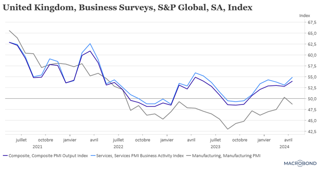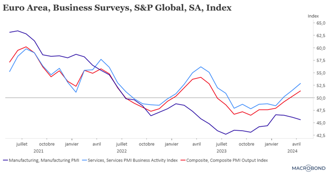 Les indices PMI en zone euro ont progressé, une nouvelle fois soutenus par le secteur des services, ce qui laisse espérer une croissance au deuxième trimestre, mais l’inflation dans les services perdure, ce qui devrait inciter la BCE à la prudence.
