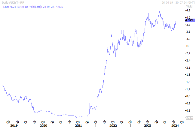 L’inflation en Australie a ralenti moins que prévu au premier trimestre, les pressions sur le coût des services restant obstinément élevées, ce qui a douché les espoirs d’une baisse des taux cette année, et provoqué une remontée du rendement de l’obligation à 2 ans.