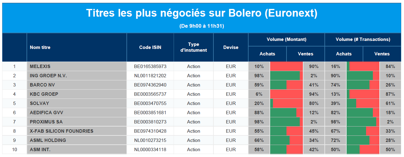 Chaque jour, nous vous offrons un aperçu des titres les plus négociés chez Bolero sur Euronext. Idéal pour prendre la température du marché boursier et pour découvrir les actions ou les titres que les autres investisseurs s'arrachent !