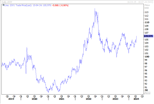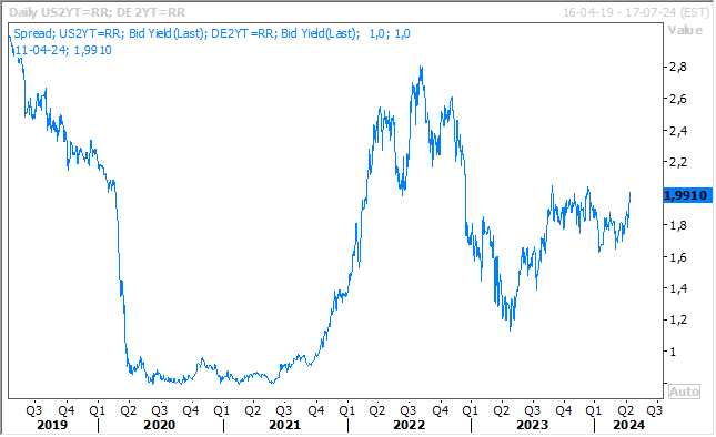 Cette hausse est évidemment le reflet du fait que la FED ne baissera pas ses taux en juin, alors que d’autres Banques centrales devraient le faire, avec comme conséquence un élargissement des différentiels de taux.