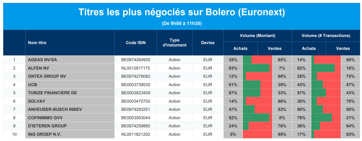 Chaque jour, nous vous offrons un aperçu des titres les plus négociés chez Bolero sur Euronext. Idéal pour prendre la température du marché boursier et pour découvrir les actions ou les titres que les autres investisseurs s'arrachent !