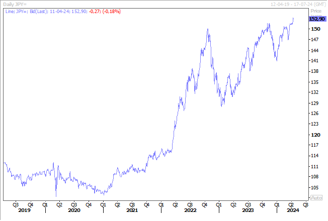 La deuxième conséquence, liée d’ailleurs à la remontée des taux américains, a été une très forte hausse du dollar, par rapport à la majorité des devises, et en particulier par rapport au yen en dépassant le seuil des 152.