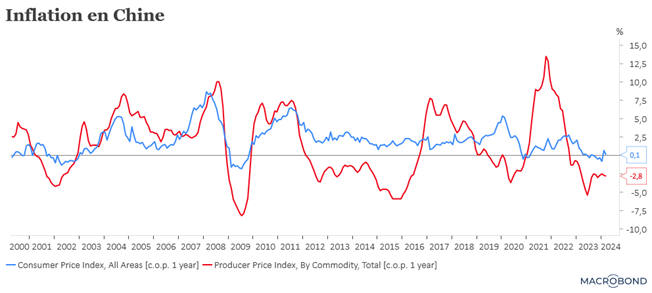 Résultat, l’inflation en Chine a surpris à la baisse et l’inflation aux États-Unis a surpris à la hausse, ce qui ne fait pas les affaires de la Banque centrale de Chine qui aura du mal à baisser ses taux.