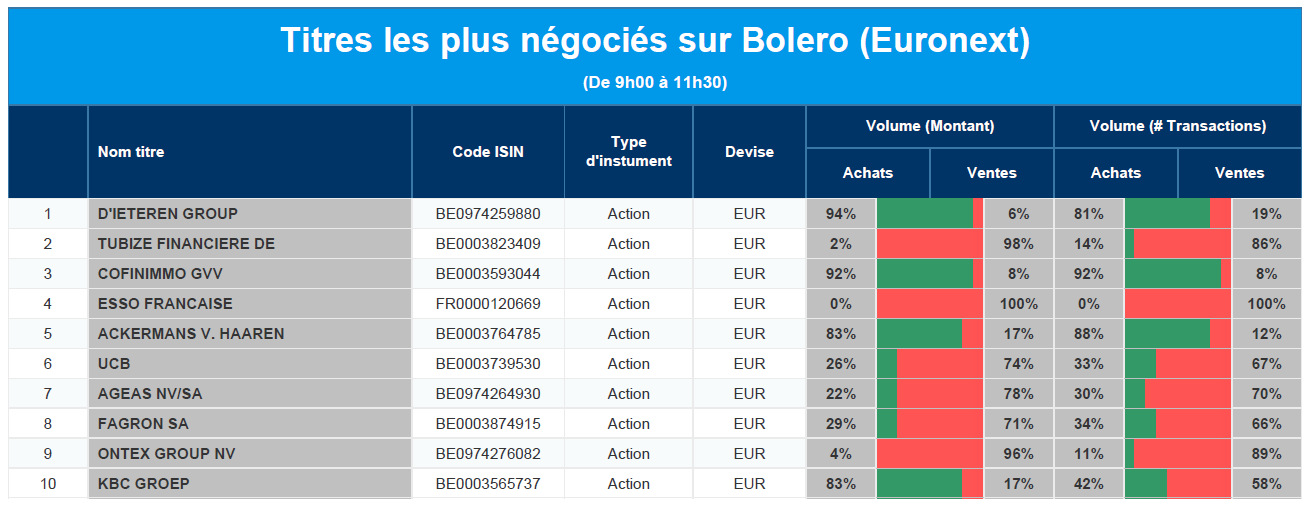 Chaque jour, nous vous offrons un aperçu des titres les plus négociés chez Bolero sur Euronext. Idéal pour prendre la température du marché boursier et pour découvrir les actions ou les titres que les autres investisseurs s'arrachent !