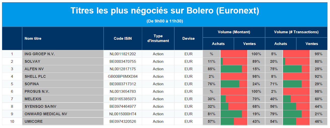 Chaque jour, nous vous offrons un aperçu des titres les plus négociés chez Bolero sur Euronext. Idéal pour prendre la température du marché boursier et pour découvrir les actions ou les titres que les autres investisseurs s'arrachent !