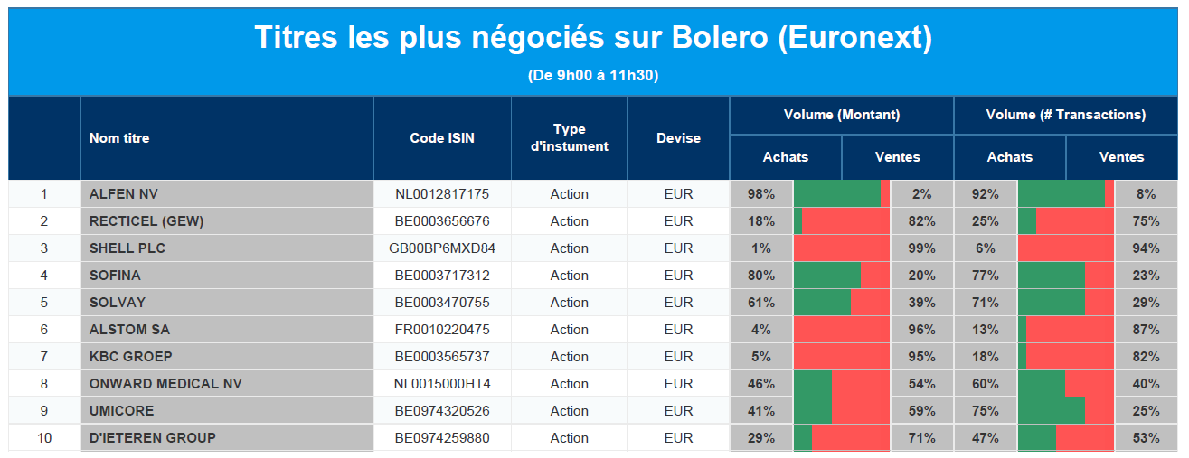 Chaque jour, nous vous offrons un aperçu des titres les plus négociés chez Bolero sur Euronext. Idéal pour prendre la température du marché boursier et pour découvrir les actions ou les titres que les autres investisseurs s'arrachent !