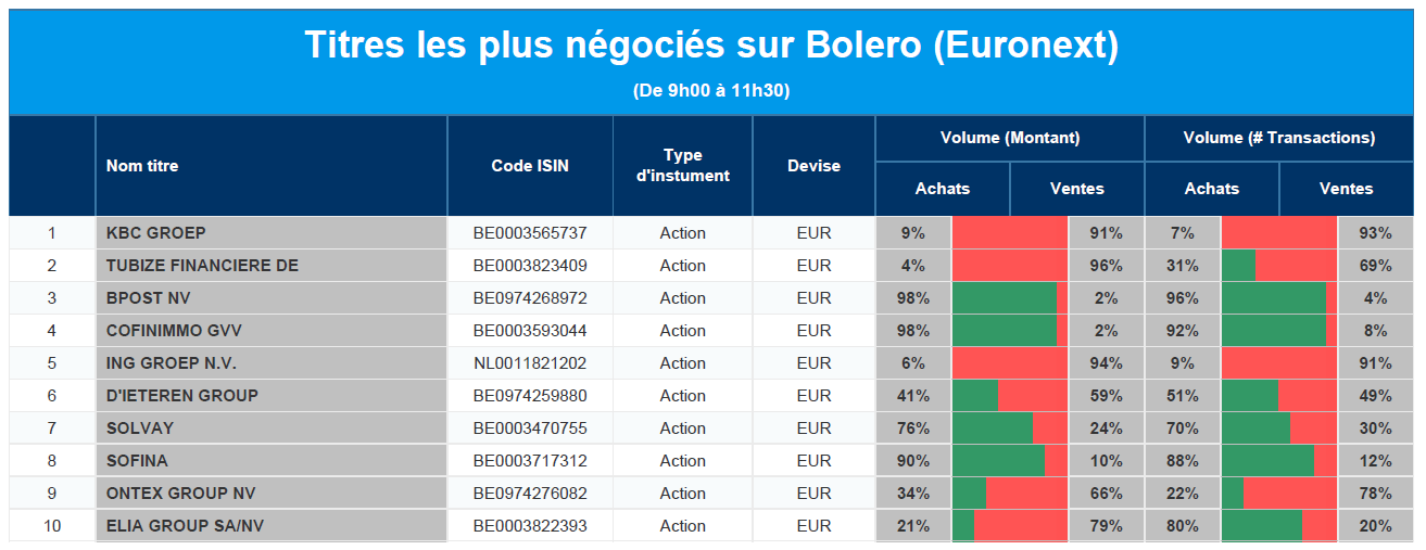 Chaque jour, nous vous offrons un aperçu des titres les plus négociés chez Bolero sur Euronext. Idéal pour prendre la température du marché boursier et pour découvrir les actions ou les titres que les autres investisseurs s'arrachent !