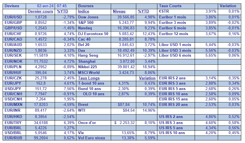 Tous ces chiffres ont réduit la probabilité d’une baisse des taux en juin à 61% contre 70% il y a une semaine, ce qui explique la fermeté du dollar par rapport à un panier de devises. Et fermeté aussi suite à la remontée des rendements obligataires.