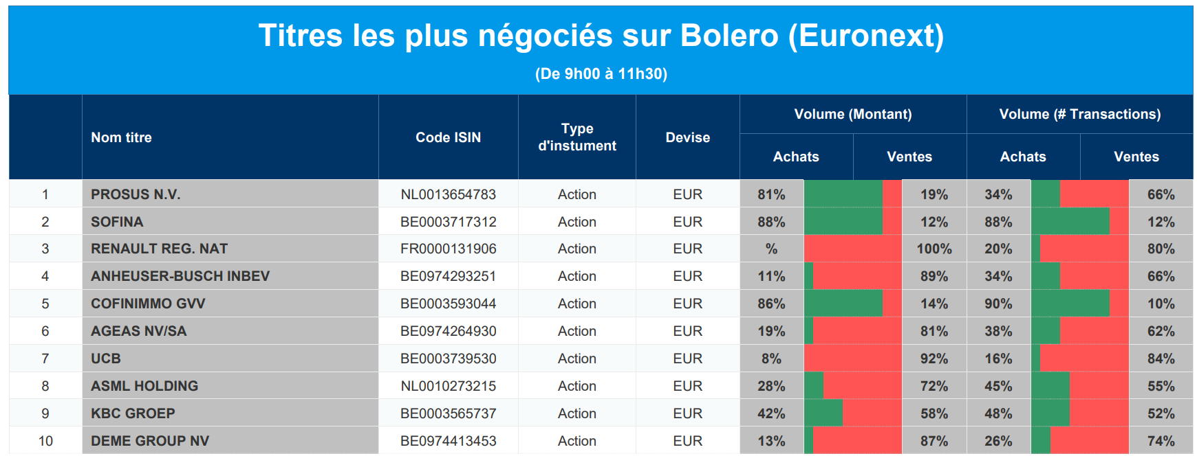 Chaque jour, nous vous offrons un aperçu des titres les plus négociés chez Bolero sur Euronext. Idéal pour prendre la température du marché boursier et pour découvrir les actions ou les titres que les autres investisseurs s'arrachent !