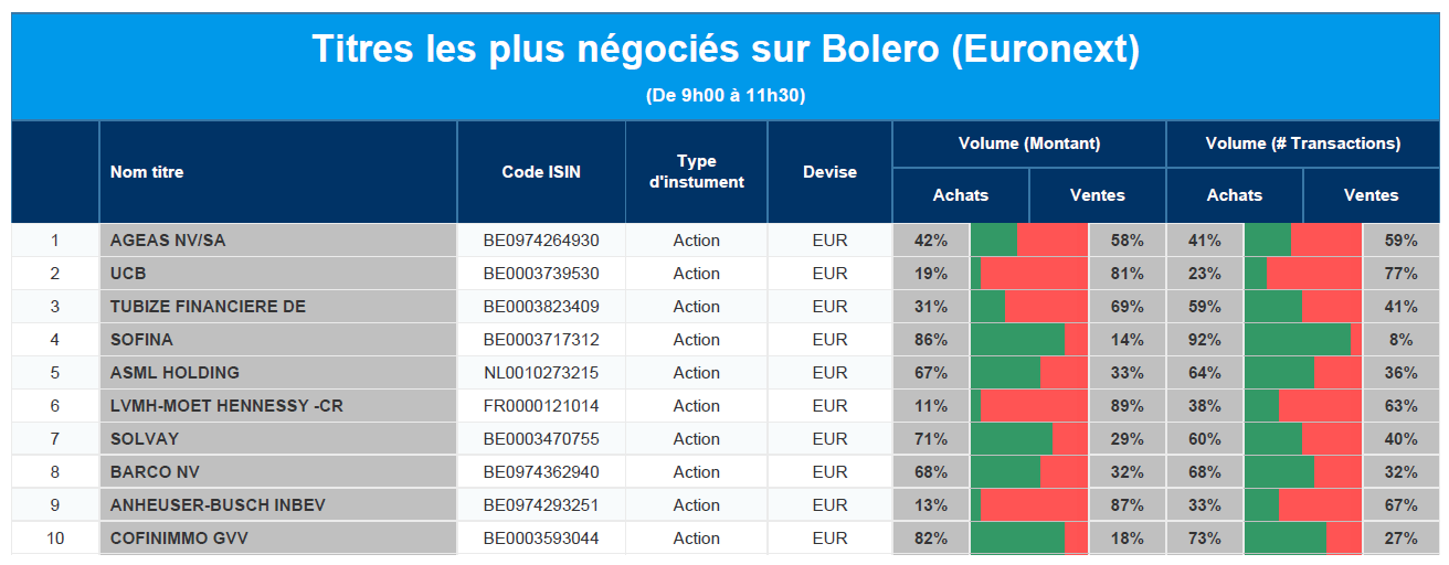 Chaque jour, nous vous offrons un aperçu des titres les plus négociés chez Bolero sur Euronext. Idéal pour prendre la température du marché boursier et pour découvrir les actions ou les titres que les autres investisseurs s'arrachent !