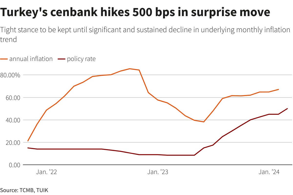 Il s’agit de la hausse de 5 % du taux directeur de la Banque centrale de Turquie, ce qui porte ce dernier à 50 %.