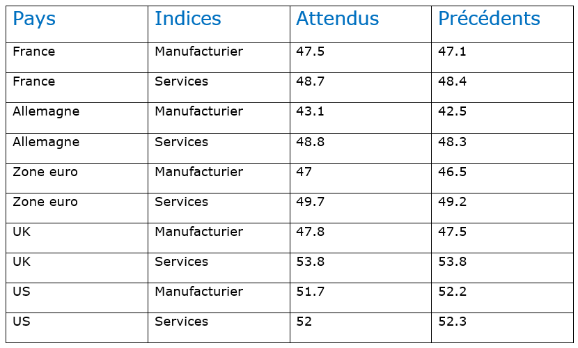 Nous avons la publication des indices PMI avec en premier lieu ceux au Japon, suivis des autres avec en principe une petite amélioration attendue comme le montre le tableau.