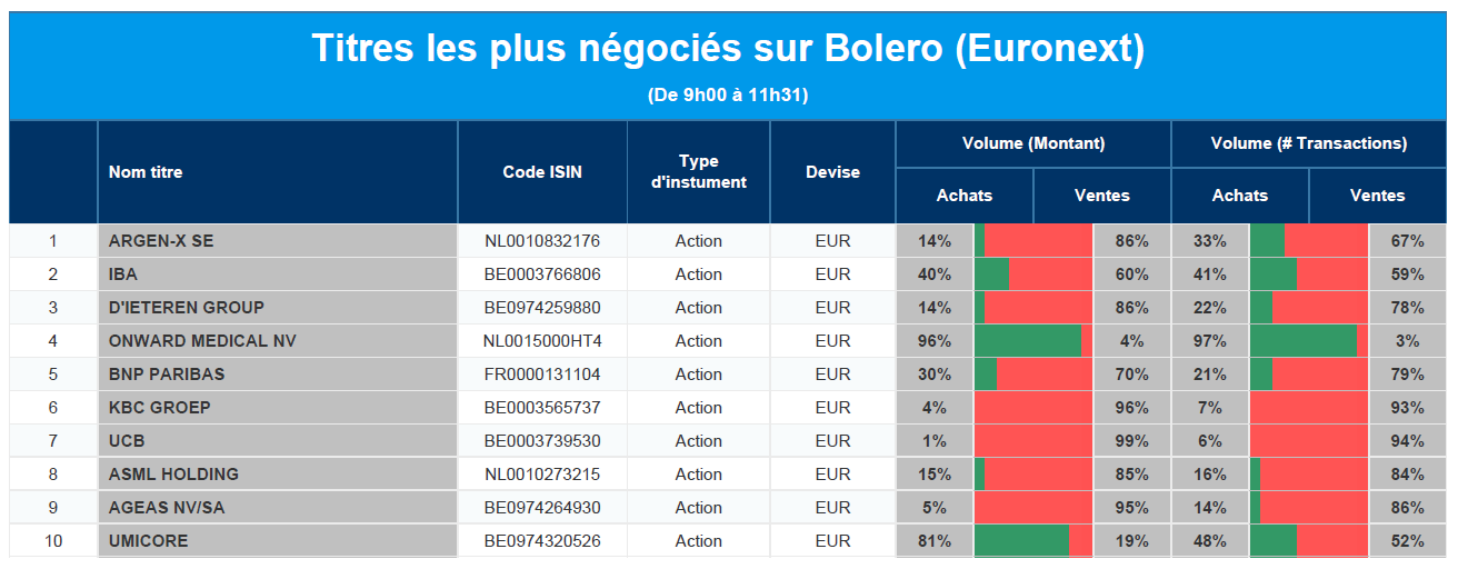 Chaque jour, nous vous offrons un aperçu des titres les plus négociés chez Bolero sur Euronext. Idéal pour prendre la température du marché boursier et pour découvrir les actions ou les titres que les autres investisseurs s'arrachent !