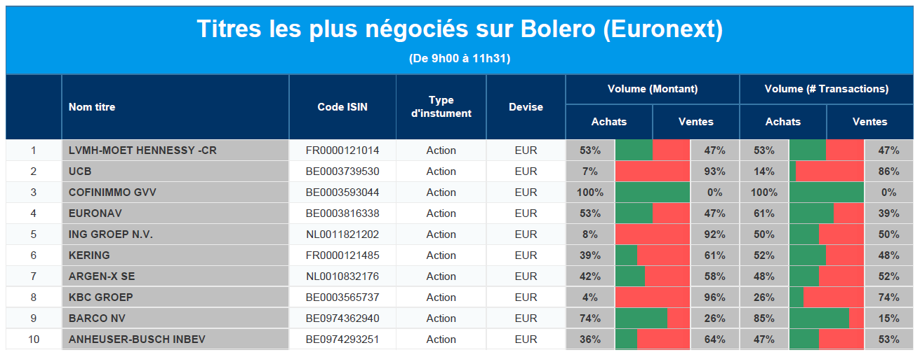Chaque jour, nous vous offrons un aperçu des titres les plus négociés chez Bolero sur Euronext. Idéal pour prendre la température du marché boursier et pour découvrir les actions ou les titres que les autres investisseurs s'arrachent !