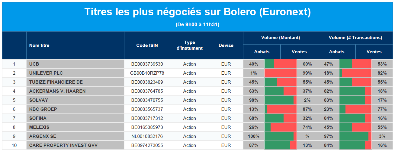 Chaque jour, nous vous offrons un aperçu des titres les plus négociés chez Bolero sur Euronext. Idéal pour prendre la température du marché boursier et pour découvrir les actions ou les titres que les autres investisseurs s'arrachent !