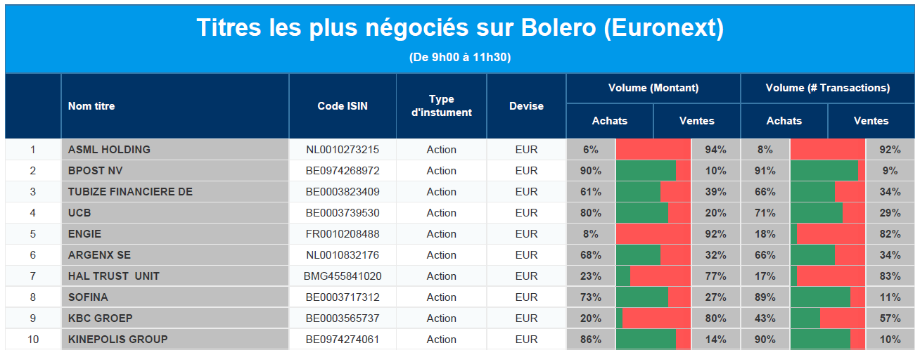 Chaque jour, nous vous offrons un aperçu des titres les plus négociés chez Bolero sur Euronext. Idéal pour prendre la température du marché boursier et pour découvrir les actions ou les titres que les autres investisseurs s'arrachent !