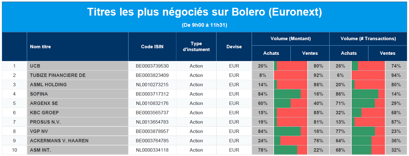 Chaque jour, nous vous offrons un aperçu des titres les plus négociés chez Bolero sur Euronext. Idéal pour prendre la température du marché boursier et pour découvrir les actions ou les titres que les autres investisseurs s'arrachent !