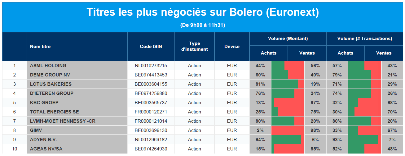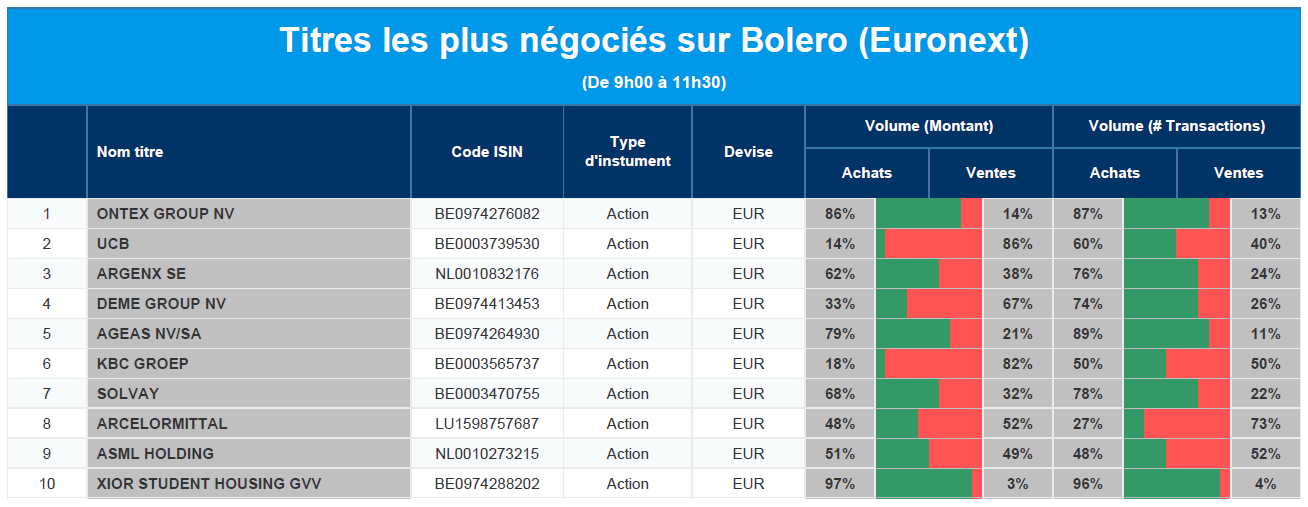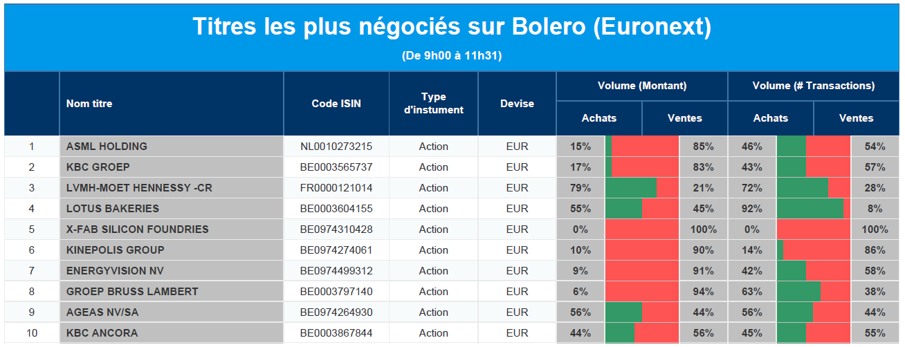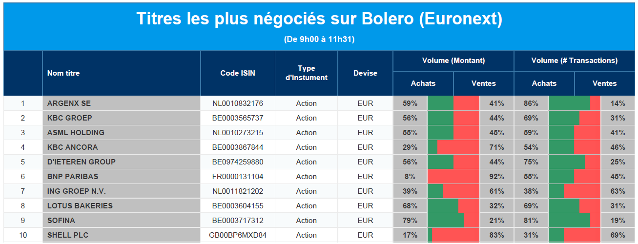 Chaque jour, nous vous offrons un aperçu des titres les plus négociés chez Bolero sur Euronext. Idéal pour prendre la température du marché boursier et pour découvrir les actions ou les titres que les autres investisseurs s'arrachent !