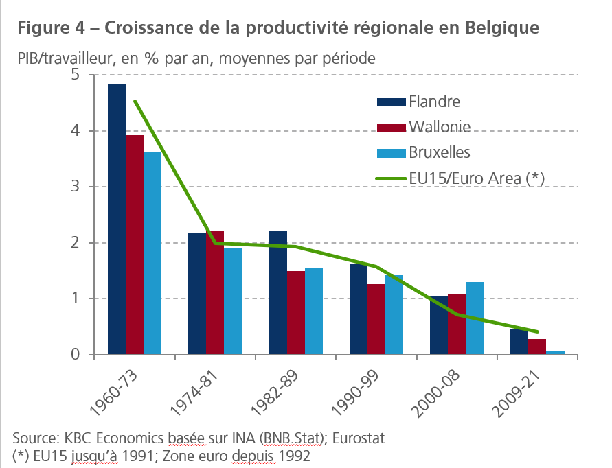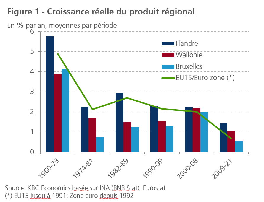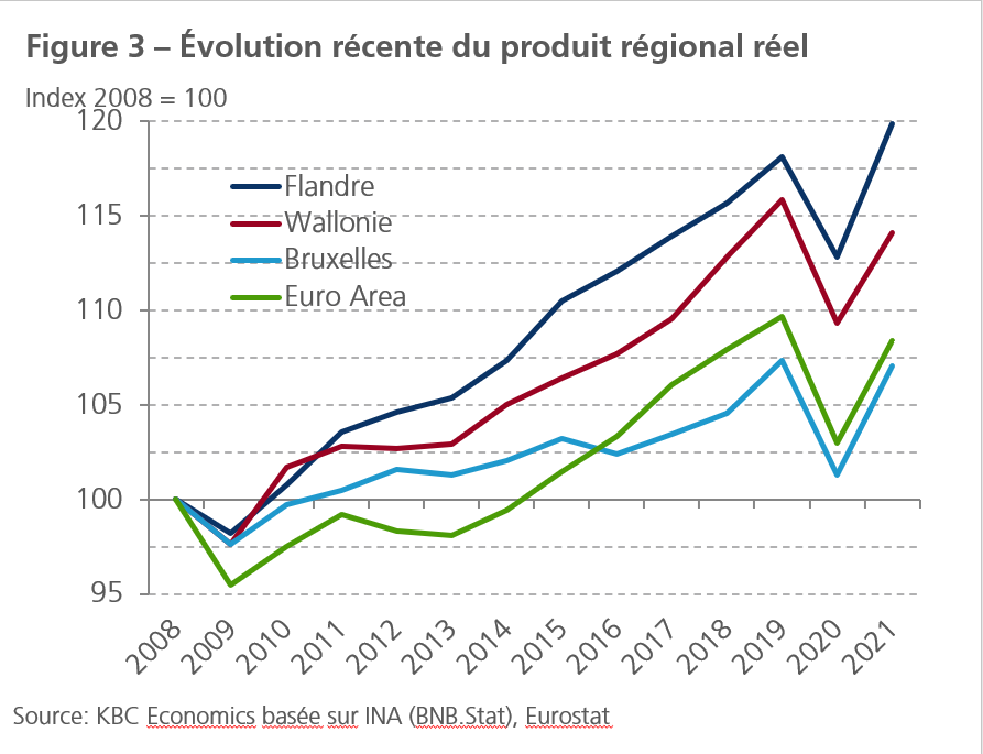 Fin janvier, l’Institut des comptes nationaux (INA) a publié de nouveaux chiffres sur les comptes régionaux en Belgique. Ceux-ci donnent une image de la manière dont les trois régions belges (Flandre, Wallonie et Bruxelles) se sont comportées les unes par rapport aux autres ces dernières années en termes de croissance économique, ou de croissance de leur « produit régional brut réel* ». Ces chiffres de croissance régionale ne sont disponibles que sur une base annuelle (il n’y a donc pas de chiffres trimestriels) et sont décalés par rapport à la publication des chiffres du PIB national. Entre-temps, pour l’ensemble de la Belgique, nous savons que – du moins si l’estimation rapide préliminaire de la croissance du quatrième trimestre est confirmée – le PIB réel a augmenté de 3,1 % en 2022. Pour les trois régions, les chiffres historiques vont jusqu’en 2021 et il n’est pas clair pour l’instant dans quelle mesure l’activité économique a progressé différemment en 2022.