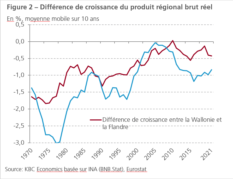 Entre la crise financière et la reprise post-pandémique (2008-2021), le produit régional brut de la Flandre, de la Wallonie et de Bruxelles a augmenté à un taux annuel moyen de 1,4 %, 1,1 % et 0,6 % respectivement en termes réels (Figure 1). Alors que les écarts de croissance régionale en Belgique s’étaient déjà réduits entre 2000 et 2008, l’avance systématique de la Flandre sur les deux autres régions avant 2000 est réapparue après 2008. Le fait que les différences de croissance régionale se soient à nouveau creusées au cours de la dernière décennie est également illustré d’une manière légèrement différente dans la Figure 2, qui montre les différences de croissance de la Flandre avec la Wallonie et Bruxelles par an respectivement, calculées en tant que moyenne mobile sur 10 ans afin d’éliminer la grande volatilité de la série.