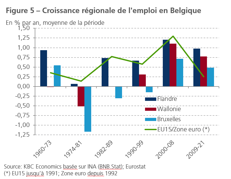 En termes simples, la croissance économique est la somme de la croissance de l’emploi et de la croissance de la productivité. Le fait que la Wallonie et Bruxelles aient à nouveau connu une croissance plus lente que la Flandre depuis 2008 est principalement dû à la quasi-stagnation de laproductivité dans les deux régions. En Flandre, elle a également fortement diminué, mais avec 0,5 % par an en moyenne, elle est restée légèrement supérieure à celle de la zone euro (0,4 %) (figure 4). La croissance de l’emploi a également été plus élevée en Flandre qu’en Wallonie (0,8 %) et à Bruxelles (0,5 %), avec une moyenne de 1,0 % par an sur la période 2008-2021 (figure 5). Ici, les trois régions belges ont fait mieux que la zone euro (0,3 %). Cela montre que la croissance du PIB a été relativement intensive en main-d’œuvre en Belgique au cours de la dernière décennie, avec des créations d’emplois principalement dans les secteurs des services où la productivité du travail est plus faible que dans l’industrie.