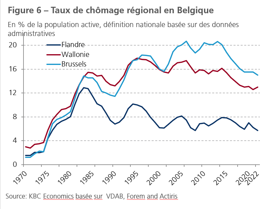 Toutefois, sur la base du taux de croissance national déjà connu et des indicateurs de conjoncture et du marché du travail disponibles au niveau régional pour 2022, nous pouvons essayer de faire une estimation approximative de la croissance régionale de l’année dernière. Pour placer notre estimation de la performance économique régionale en 2022 dans une perspective un peu plus large, nous avons d’abord souligné dans la section 2 de ce rapport de recherche la trajectoire historique de la croissance relative de la Flandre, de la Wallonie et de Bruxelles au cours des années précédant 2022. L’INA fournit les taux de croissance régionaux pour la période 2003-2021 selon la norme du SEC 2010 (Système européen des comptes). Comme pour les précédentes publications de données, la dernière publication de l’INA a partiellement révisé les taux de croissance historiques relatifs à cette période. Les chiffres de croissance plus anciens, antérieurs à 2003, que nous présentons dans certaines figures et qui sont basés sur des systèmes comptables antérieurs, proviennent de la base de données de KBC Economics. Dans la section 3 du rapport, nous examinons l’évolution des indicateurs régionaux disponibles sur le cycle économique et le marché du travail en 2022. Cette analyse nous permet, dans la section 4, de faire une première estimation (très approximative) de la vigueur de la croissance dans les trois régions en 2022.