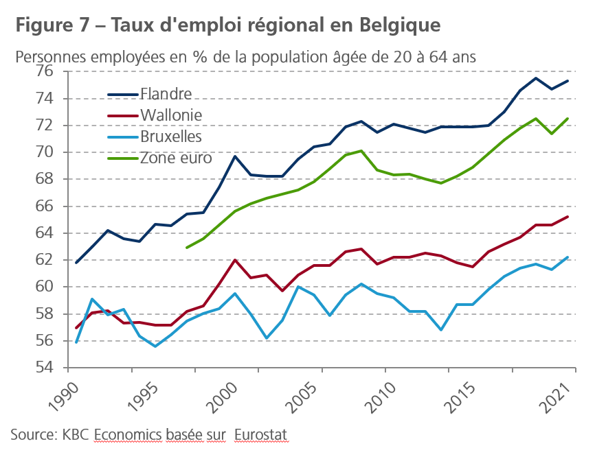 La croissance moyenne de l’emploi plus faible à Bruxelles sur la période 2008-2021 que dans les deux autres régions s’est également traduite par une dynamique relativement moins bonne du taux de chômage (la part des chômeurs dans la population active) et du taux d’emploi (la part des personnes ayant un emploi dans la population en âge de travailler) (figures 6 et 7). C’était du moins le cas jusqu’en 2014 : pendant la crise financière de 2008-2013, les deux taux se sont davantage détériorés. Fait remarquable, la situation du marché du travail à Bruxelles s’est nettement améliorée depuis lors, ce qui a permis de réduire l’écart encore important avec la Wallonie et surtout la Flandre. Dans le contexte d’une croissance économique relativement faible dans cette région, cela suggère que de plus en plus de Bruxellois ont trouvé un emploi en dehors de la frontière régionale ces dernières années.