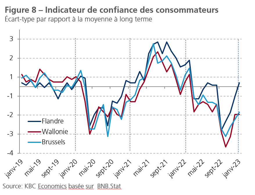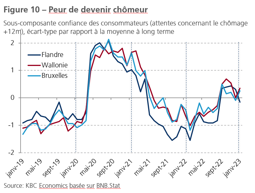 Plus spécifiquement, la confiance relativement meilleure des consommateurs en Flandre se reflète également dans la sous-composante qui évalue les attentes des consommateurs en matière de chômage au cours des 12 prochains mois (figure 10). Cette composante indique pour les trois régions une forte baisse de la crainte des citoyens de devenir chômeurs depuis la fin 2020, mais elle s’est à nouveau détériorée après l’invasion de l’Ukraine par la Russie en février 2022. En Flandre, à l’exception des mois les plus récents, l’indicateur était nettement inférieur à celui de la Wallonie et de Bruxelles tout au long de cette période. L’indicateur de la peur du chômage est une information importante pour estimer la propension à l’épargne de précaution des ménages, et donc l’évolution de la consommation privée. Cette propension a vraisemblablement été un peu plus faible en Flandre que dans les deux autres régions en 2022.