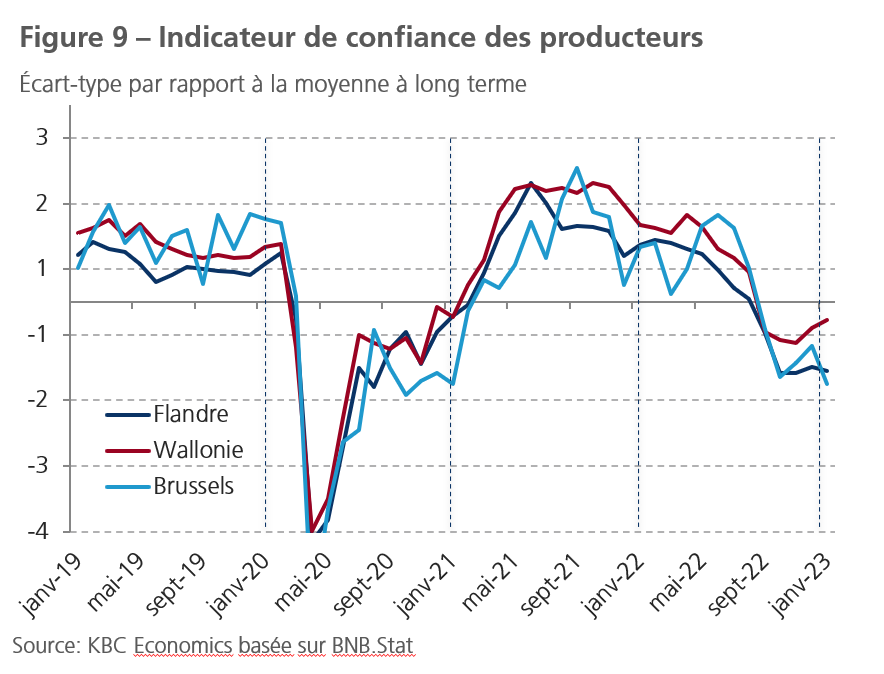 Les indicateurs conjoncturels classiques, y compris la confiance des consommateurs et des producteurs, peuvent aider à comprendre l’évolution relative de l’activité économique régionale en 2022 (figures 8 et 9). Étant donné qu’il existe d’importantes différences de niveau à long terme entre les séries chronologiques brutes des trois régions, nous avons rééchelonné les deux indicateurs pour chaque région sous forme d’écarts types par rapport à la moyenne à long terme. La figure 8 montre que la confiance des consommateurs en Flandre est non seulement remontée plus rapidement après le creux pandémique de 2020-2021, mais qu’elle a également continué à enregistrer des niveaux plus élevés qu’en Wallonie et à Bruxelles pendant le ralentissement de 2022 à la suite de l’invasion de l’Ukraine par la Russie. Plus récemment, l’indicateur en Flandre s’est redressé un peu plus rapidement – dès le mois d’octobre – et plus fortement que dans les deux autres régions. Ainsi, en janvier 2023, il était déjà revenu au-dessus de sa moyenne de long terme en Flandre, ce qui était loin d’être le cas ailleurs.