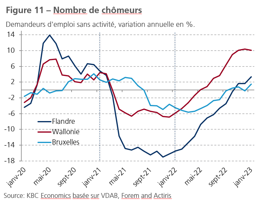 Nous pouvons vérifier l’évolution du chômage effectif dans les trois régions en examinant la dynamique du nombre de demandeurs d’emploi non actifs inscrits auprès des agences régionales pour l’emploi (VDAB, Forem et Actiris). La figure 11 montre l’évolution de ce groupe d’une année à l’autre afin d’éliminer les effets saisonniers. Pendant la pandémie, il a atteint un pic légèrement plus élevé en Flandre qu’en Wallonie au printemps 2020. À Bruxelles, ce pic est tombé plus tard et a également été beaucoup plus limité. Lors de la reprise économique en 2021, le nombre de demandeurs d’emploi non actifs a diminué beaucoup plus fortement en Flandre qu’en Wallonie et à Bruxelles. Début 2022, la dynamique est redevenue négative dans les trois régions, dans le sillage de la crise ukrainienne et énergétique. En Flandre, la variation annuelle du nombre de demandeurs d’emploi n’est redevenue positive qu’en novembre. En Wallonie, c’était déjà le cas en mai. Sur l’ensemble de l’année 2022, ce nombre était encore en moyenne inférieur de 7,3 % et de 2,9 % en Flandre et à Bruxelles respectivement par rapport à 2021, et supérieur de 2,2 % en Wallonie. En janvier 2023, ces chiffres étaient respectivement supérieurs de 3,4 %, 10,0 % et 1,5 % à ceux de l’année précédente.