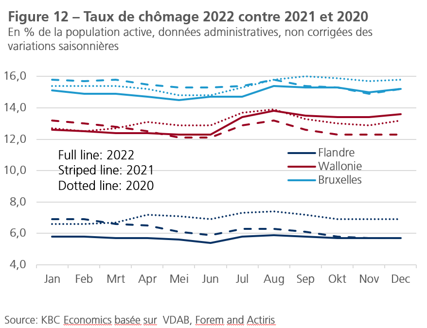 Des données mensuelles sont également disponibles sur les taux de chômage régionaux publiés par les agences régionales pour l’emploi (VDAB, Forem et Actiris). Ces données sont également basées sur des données administratives non corrigées des variations saisonnières, de sorte que nous devons comparer chaque taux de chômage mensuel d’une année à l’autre (figure 12). Une fois de plus, la Wallonie a obtenu des résultats relativement moins bons que la Flandre et Bruxelles en 2022. Le taux de chômage y a augmenté plus fortement depuis le printemps et a dépassé non seulement les chiffres mensuels correspondants de 2021, mais aussi ceux de 2020. En Flandre et à Bruxelles, le taux de chômage à la fin 2022 est resté proche de celui de la fin 2021 et nettement inférieur à celui de la fin 2020. La figure 6, que nous avons examinée dans la première partie de ce rapport, montre le taux de chômage annuel moyen en 2022 (en utilisant la même définition) et indique qu’en Wallonie, il a augmenté de 0,4 point de pourcentage pour atteindre 13,0 %, tandis que la Flandre et Bruxelles ont toutes deux enregistré une baisse de 0,5 point de pourcentage pour atteindre respectivement 5,7 % et 15,0 %.