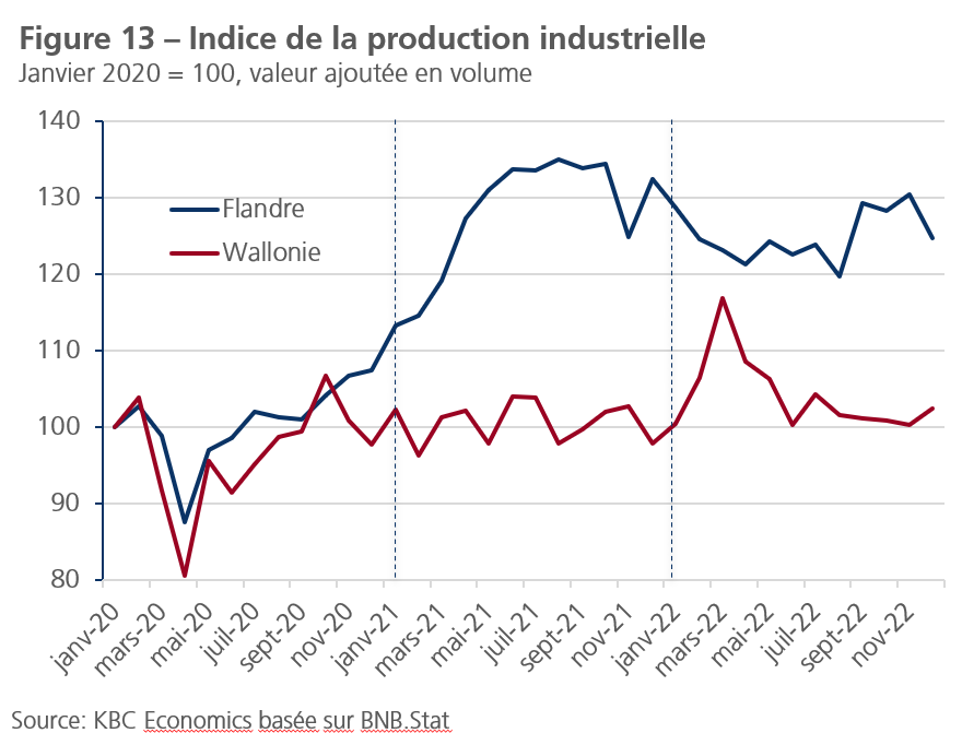 Hormis les chiffres du marché du travail, peu d’indicateurs conjoncturels régionaux « concrets » sont disponibles de manière régulière. De plus, certains d’entre eux, comme les chiffres des exportations et des importations régionales, ne sont disponibles qu’en valeur. En période d’inflation élevée et croissante, comme en 2022, il est difficile de tirer des conclusions sur l’évolution de l’activité économique réelle. Cependant, les chiffres de la production industrielle sont disponibles pour les régions en termes de volume et corrigés des effets saisonniers. La figure 13 montre sa dynamique pour la Flandre et la Wallonie au cours des trois dernières années. À Bruxelles, avec son économie de services typique, la part de l’industrie manufacturière n’est que de 2 %, ce qui fait que l’inclusion de cette région dans l’analyse n’a pas de sens.