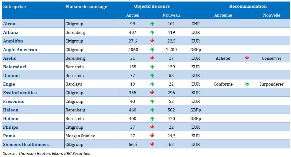 - Aedifica {{15954457, AEDIFICA SA, AED}} : S&P a placé Aedifica sous CreditWatch avec implications positives après l'annonce de la fusion avec Cofinimmo. Cela signifie qu'Aedifica pourrait bénéficier d’une note de crédit améliorée après la fusion [de BBB à BBB+], ce qui pourrait représenter une économie d’environ 15 points de base sur les futurs refinancements de sa dette. Les premières obligations de référence de Cofinimmo n'arrivent pas à échéance avant l'exercice 2028, de sorte que l'effet ne sera pas visible avant cette date. KBCS maintient sa recommandation « Conserver » et son objectif de cours de 70 euros.