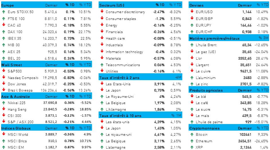 - Sur le marché du pétrole, on note une légère baisse des cours. Aux États-Unis, le cours du baril a perdu 0,4 % à 63,12 dollars, ce qui ramène la progression hebdomadaire à 3,8 %. Le cours de l'or a augmenté de 0,4 % à 3366,78 dollars l'once, soit un gain hebdomadaire de 2,3 %.