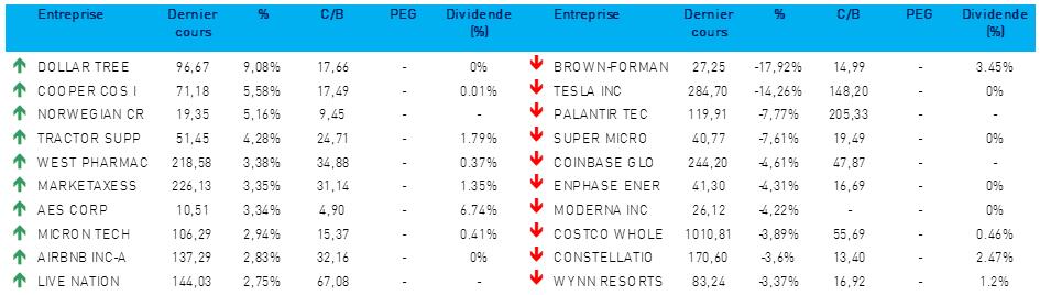 - Lululemon {{18673894, LULULEMON ATHLETICA INC., LULU}} : le fabricant canadien de vêtements de sport et de loisirs révise à la baisse ses prévisions de bénéfice pour l'exercice en raison des coûts supplémentaires résultant des droits de douane américains et d’une certaine faiblesse de la demande pour ses nouvelles collections. L’estimation du bénéfice par action pour l’exercice se situe désormais entre 14,58 et 14,78 dollars, au lieu de la prévision précédente de 14,95 à 15,15 dollars. La prévision moyenne des analystes était plus élevée encore. Les ventes de nouvelles gammes telles que Glow Up et Daydrift sont restées à la traîne, et la baisse de la fréquentation des magasins de la chaîne aux États-Unis reflète l'incertitude économique et la chute de la confiance des consommateurs. Lululemon prévoit des mesures d’économie, des augmentations de prix et des négociations avec les fournisseurs pour atténuer la pression sur ses marges.