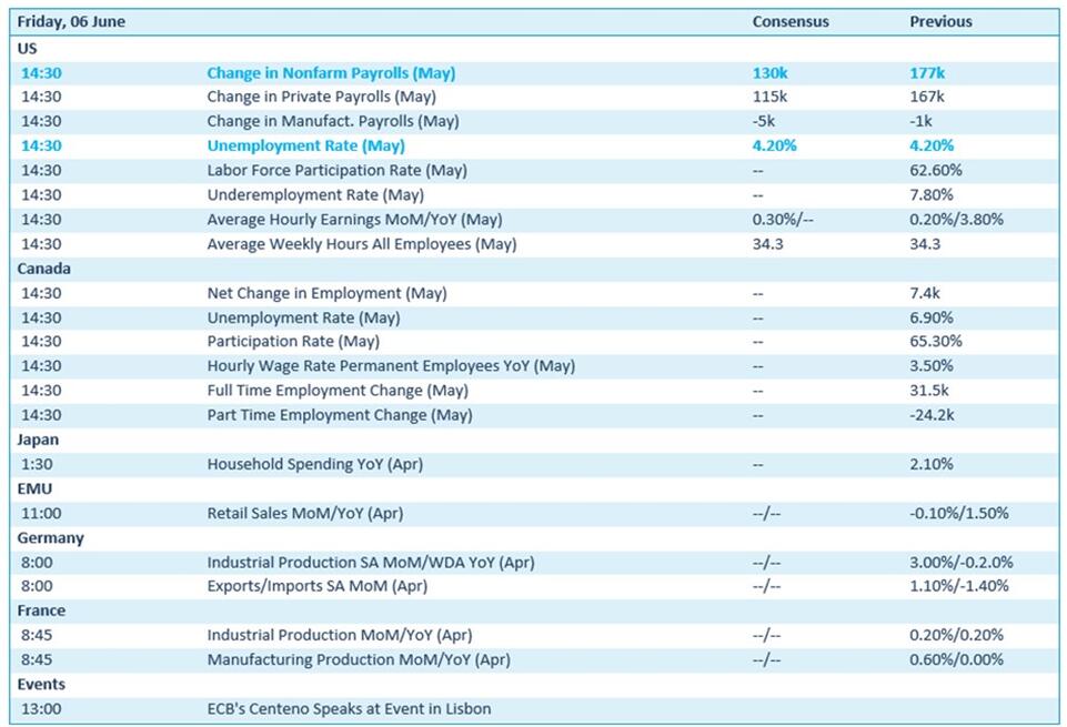 - Après la décision de la Banque centrale européenne sur les taux d'intérêt, nous attendons aujourd'hui la publication du rapport sur le marché de l’emploi aux États-Unis. Ce rapport, qui couvre le mois de mai, devrait fournir des précisions en matière de chômage et de progression des salaires, deux informations majeures pour les perspectives de croissance et d'inflation. De son côté, l'Europe publie le chiffre des ventes du secteur du commerce de détail pour le mois d'avril, tandis que l'Allemagne et la France produisent les statistiques de la production industrielle et des données sur les importations et les exportations. Tout ça est très bien, mais par ailleurs, on n’attend pratiquement aucune publication de résultats d’entreprises aujourd’hui.