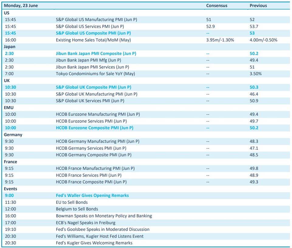 - États-Unis, Japon, Royaume-Uni, UE, Allemagne, France : indices de sentiment PMI (juin), de S&P Global, Jibun et HCOB, pour le secteur des services et pour l'industrie manufacturière