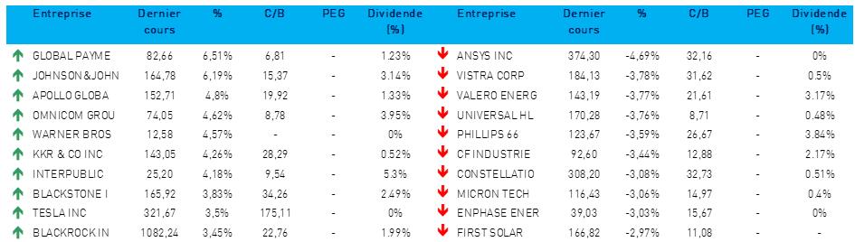 - Ford {{264959, FORD MOTOR CO., F}} : l’action a dû céder du terrain après l’annonce, par l'agence américaine de sécurité routière (NHTSA), du rappel par le constructeur de près de 700 000 SUV, en raison de la possibilité de fuites de carburant susceptibles, selon la NHTSA, d’accroître le risque d'incendie.