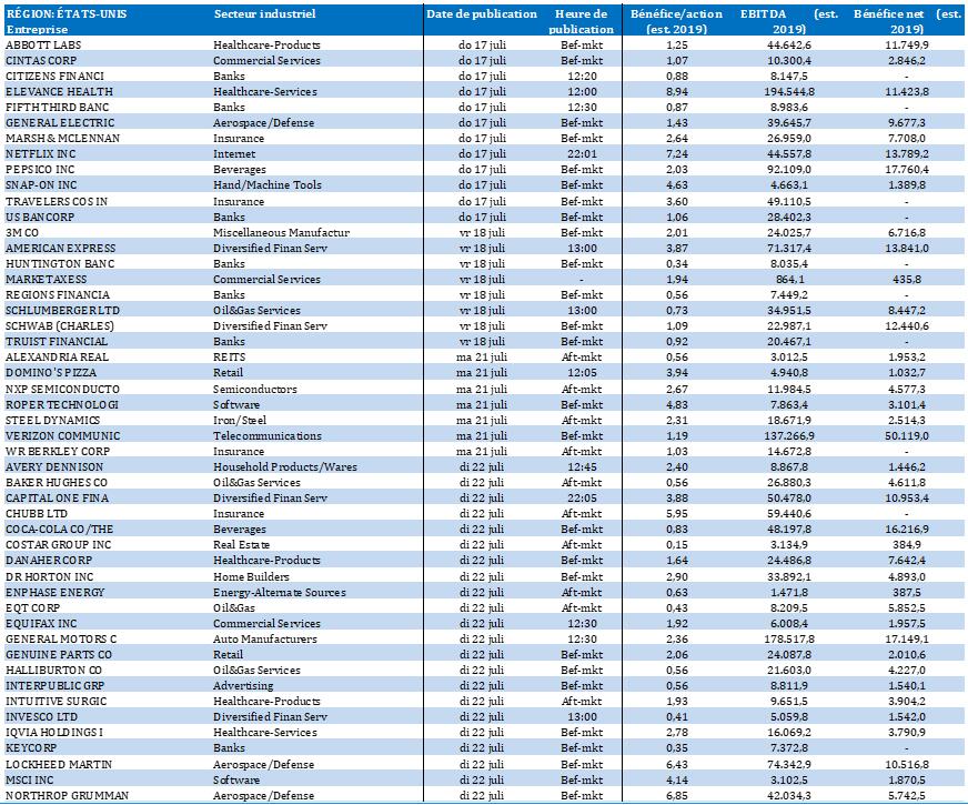 - Goldman Sachs {{11672499, GOLDMAN SACHS GROUP INC., GS.PRA}} : la banque d'investissement américaine annonce pour le 2e trimestre un bénéfice de 3,7 milliards de dollars, soit 10,91 dollars par action, ce qui dépasse nettement la moyenne des prévisions des analystes (9,53 dollars). Le chiffre d’affaires du trading en actions progresse de 36% à 4,3 milliards de dollars, et celui de la banque d'investissement, de 26% à 2,19 milliards de dollars, grâce à un rebond de l’activité de fusions et acquisitions. Malgré une légère baisse du chiffre d'affaires réalisé en gestion d’actifs et une augmentation des provisions pour débiteurs douteux, la banque rese le principal opérateur mondial dans le domaine du conseil et d’accompagnement de transactions à l'échelle mondiale. Le carnet de commandes bien rempli de la banque d'investissement laisse augurer d’un climat de transactions actif au cours des prochains trimestres.
